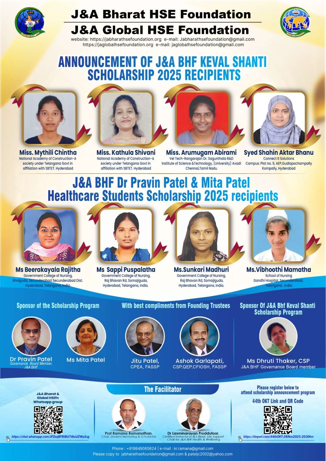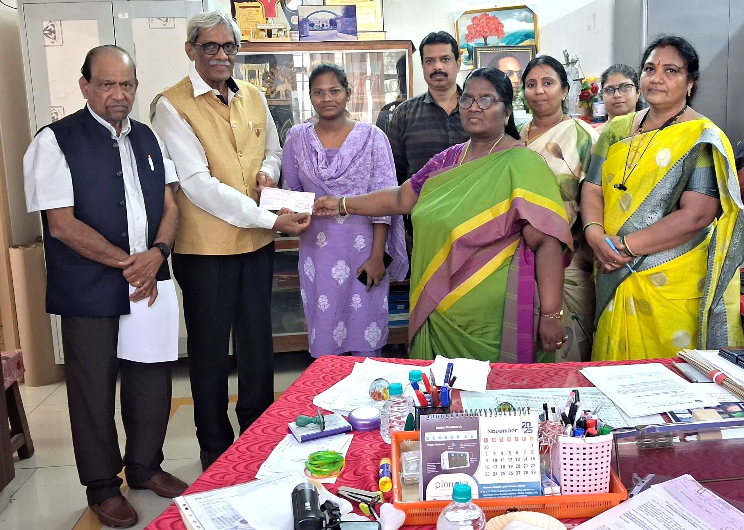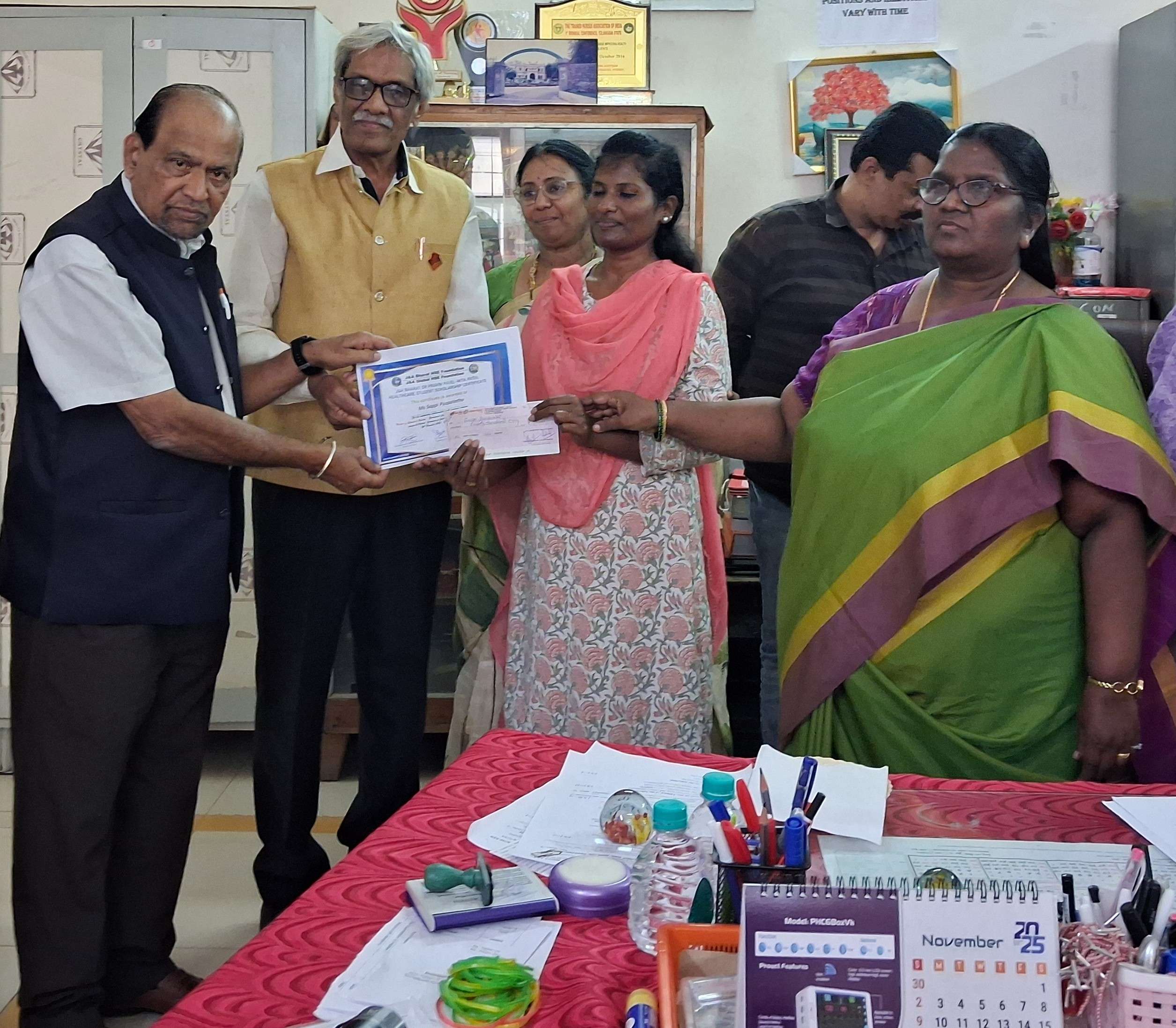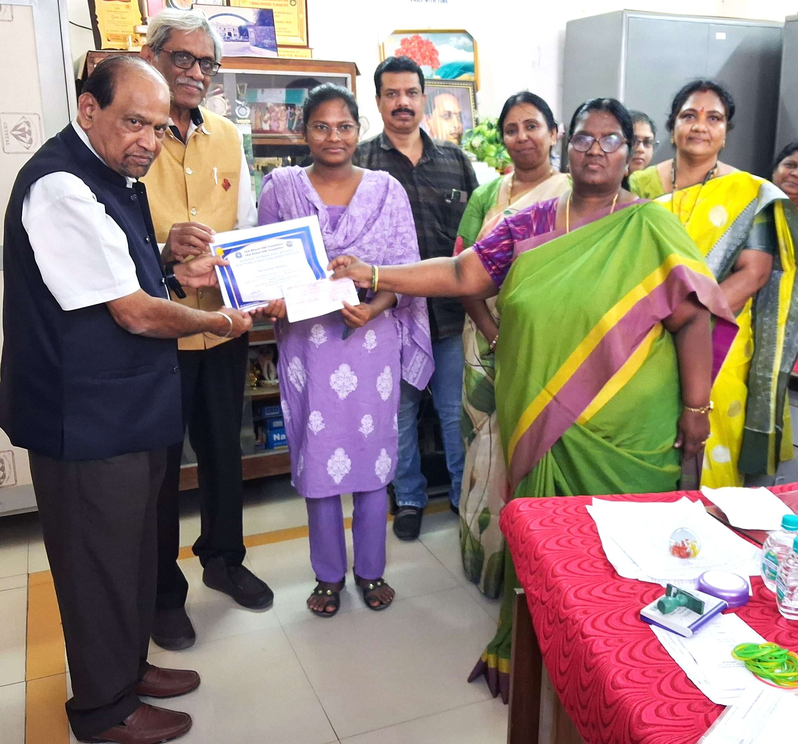 On 3rd November 2025 at Gandhi Hospital, scholarship certificates and cheques were awarded to two candidates under the Dr. PP MP Healthcare Student Scholarship 2025, an initiative of the J&A Bharat HSE Foundation / J&A Global HSE Foundation. The recipients were Vibhooti Mamatha from the Government School of Nursing, Gandhi Medical College, and Beerakayala Rajith from the Government College of Nursing, Bhoiguda, Secunderabad. The scholarship cheques were formally handed over by Dr. Laxminarayan Proddutoor and Prof. Ramana.