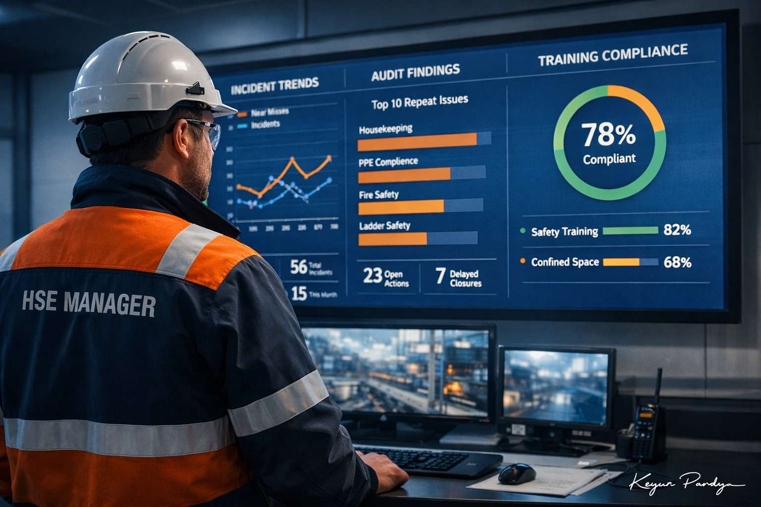 Near-miss logs, audit findings, training records, PTW observations, inspection sheets, action trackers.